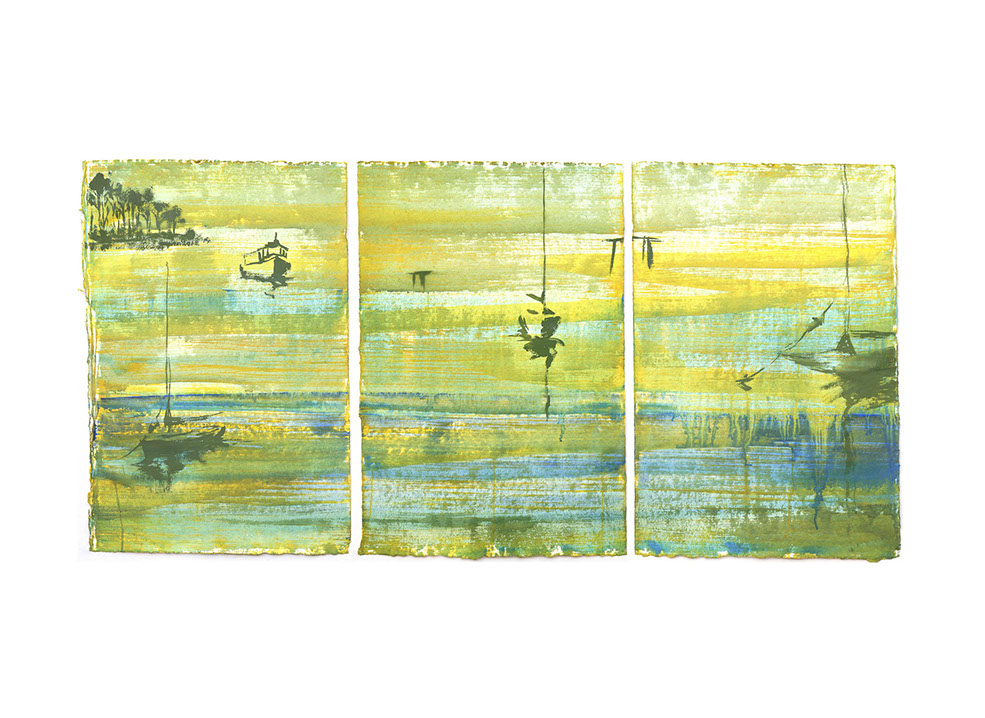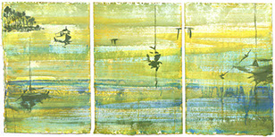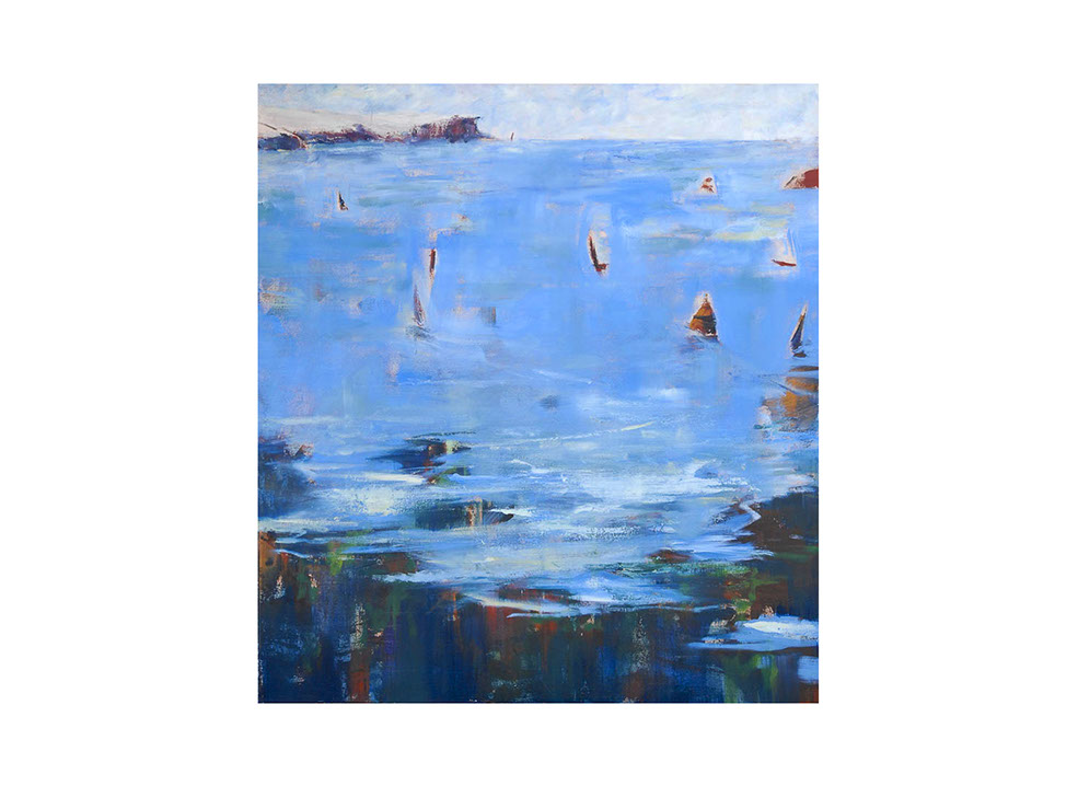 I have experimented with various media including pen and ink, watercolour, gouache and oil on canvas and linen to explore my responses to the experience of being on and around our wonderful waterways, feeling the breeze and watching the dancing reflections of